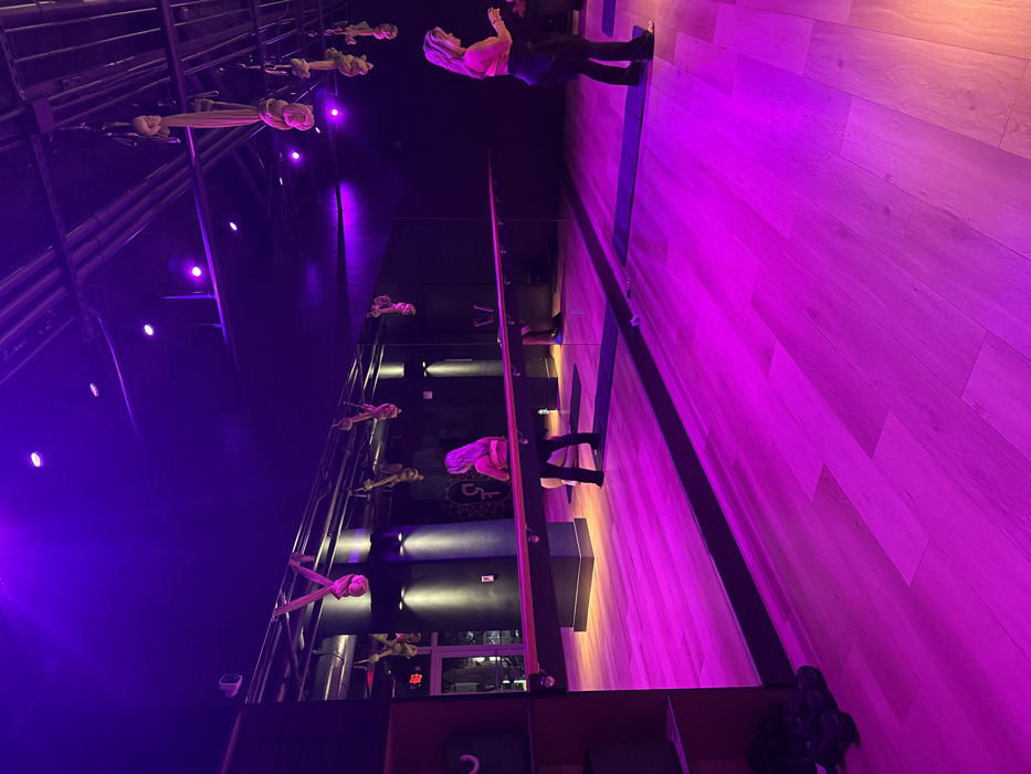 A dimly lit interior space with a tall, mirrored wall reflecting a woman standing on a wooden floor. Above, aerial silks are suspended from the ceiling. The room is illuminated with purple lighting, creating a vibrant ambiance. The wooden floor reflects the purple light, adding to the overall colorful effect.
