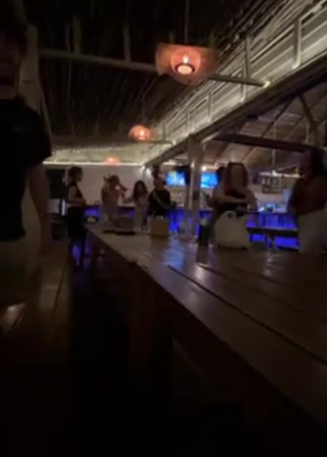 interior of a dimly lit bar with a thatched roof. Several people are standing around a long wooden table, some appearing to be preparing drinks or gathering items. A bartender can be seen behind a brightly lit bar area. One man in a black shirt walks towards the camera. Decorative lighting hangs from the ceiling, creating a warm ambiance. The bar seems to be open and airy.