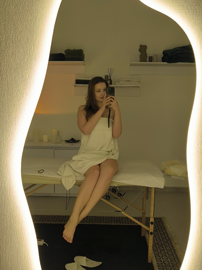 A mirror selfie reveals a woman wrapped in a white towel, seated on a treatment table in a spa setting
