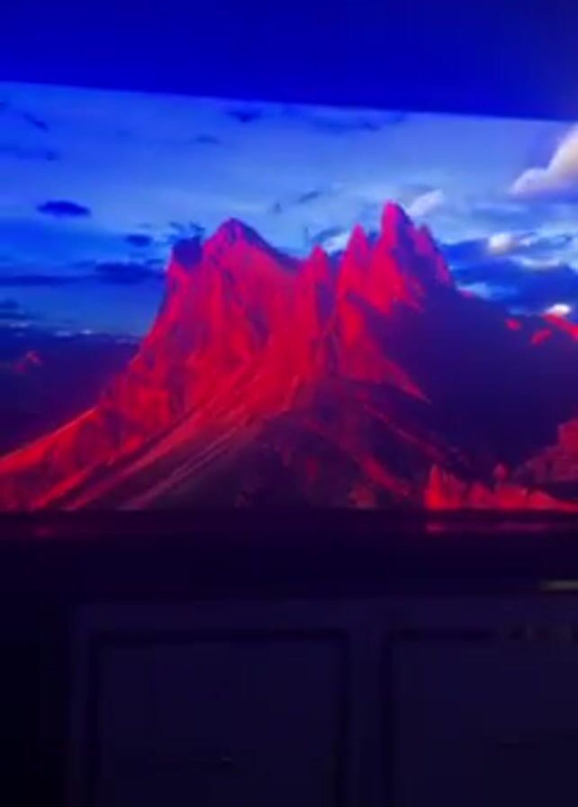 screen displaying a mountain range with red peaks under a blue sky with clouds. The bottom of the screen is obscured by what appears to be a dark cabinet with two doors and handles. The lighting in the room is dim and blue, possibly from the screen itself.
