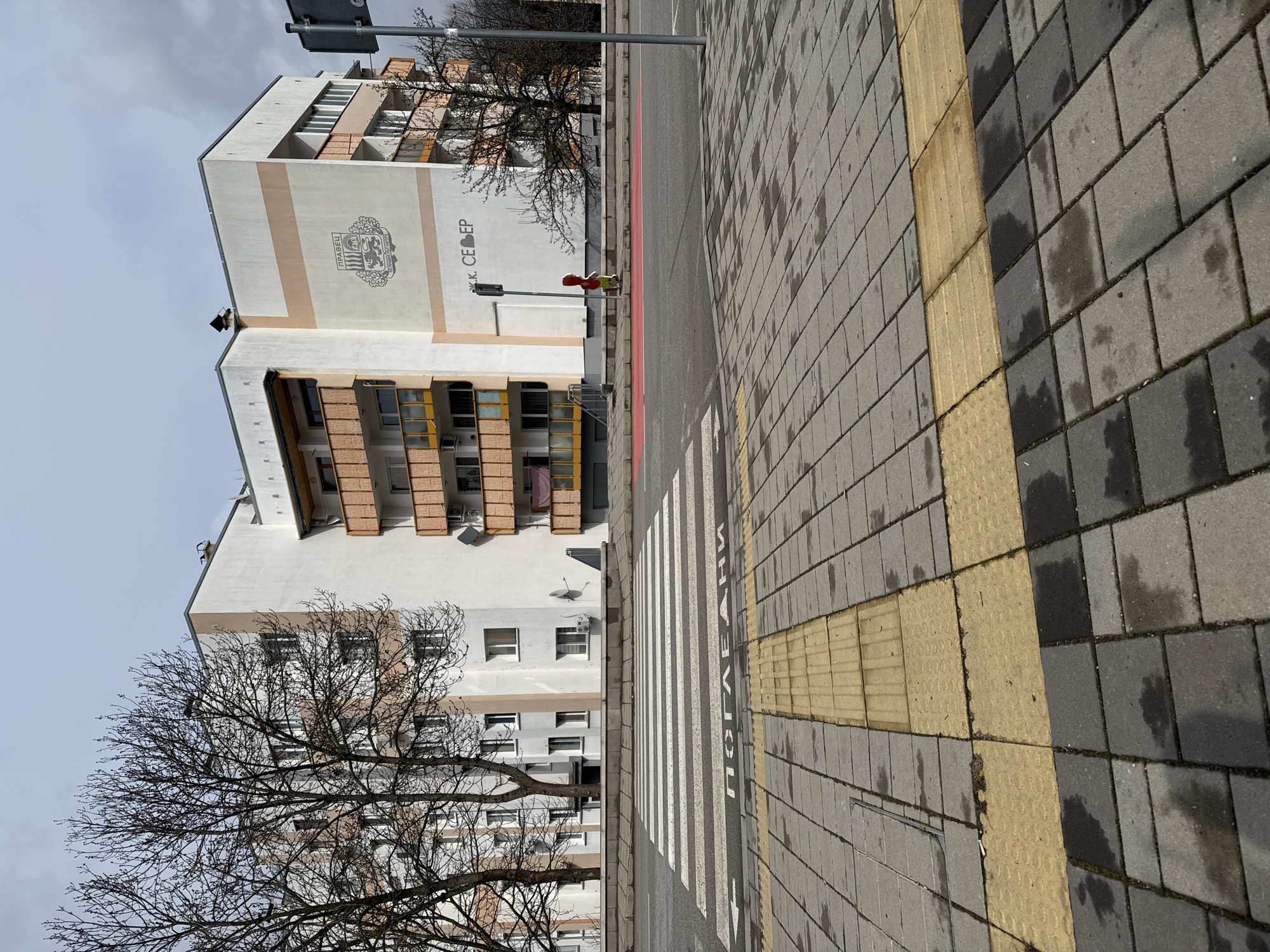 The image depicts an urban street scene in Pravets, Bulgaria, specifically within the North Residential Complex (Ж.К. Север), under a partially cloudy sky. In the foreground, a grey paver sidewalk features a central yellow tactile paving strip that appears damp. The midground presents an asphalt street with a prominent white zebra pedestrian crossing. Below the crossing, the Cyrillic word "ПОГЛЕДНИ" (LOOK) and an arrow are painted on the asphalt, directing attention to the crosswalk. To the right of the crosswalk, the road transitions into a solid red asphalt lane. A single individual, possibly a child, clad in a red top and light-colored trousers, walks leftward on the sidewalk across the street. The background is dominated by a multi-story residential building, primarily white with peach-toned architectural accents and numerous balconies featuring orange railings and yellow undersides. A large painted crest, identified as the coat of arms of Pravets, is visible on the building's facade, accompanied by the text "ПРАВЕЦ" above and "Ж.К. СЕВЕР" below. Several bare deciduous trees flank the building, and multiple satellite dishes are affixed to its exterior. A metal pole, likely a traffic sign or light post, stands on the right side of the roadway.