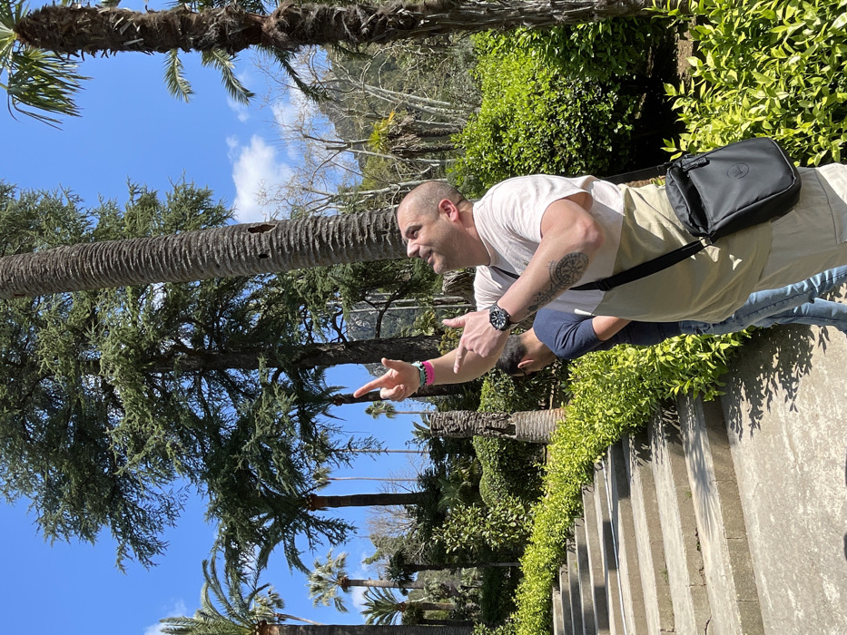 This image depicts an outdoor scene within the Jardines de Alfabia in Bunyola, Spain, on a clear, sunny day. The primary subject is a male, light-skinned individual, bald, wearing a light-colored two-tone short-sleeved shirt, light-colored bottoms, and a black cross-body bag. He has a black wristwatch on his left wrist, pink and black bracelets on his right wrist, and a compass rose tattoo on his right bicep. He is actively looking upward, with his right arm raised and index and middle fingers extended, and his left arm also raised and pointing upward with his index finger. Behind him, partially obscured and facing away from the camera, is another male individual wearing a dark t-shirt and blue jeans. The foreground features concrete steps bordered by manicured green hedges. The background consists of a dense arrangement of tall palm trees, large evergreen trees, and other diverse foliage, with distant mountains visible beneath a bright blue sky scattered with white clouds.