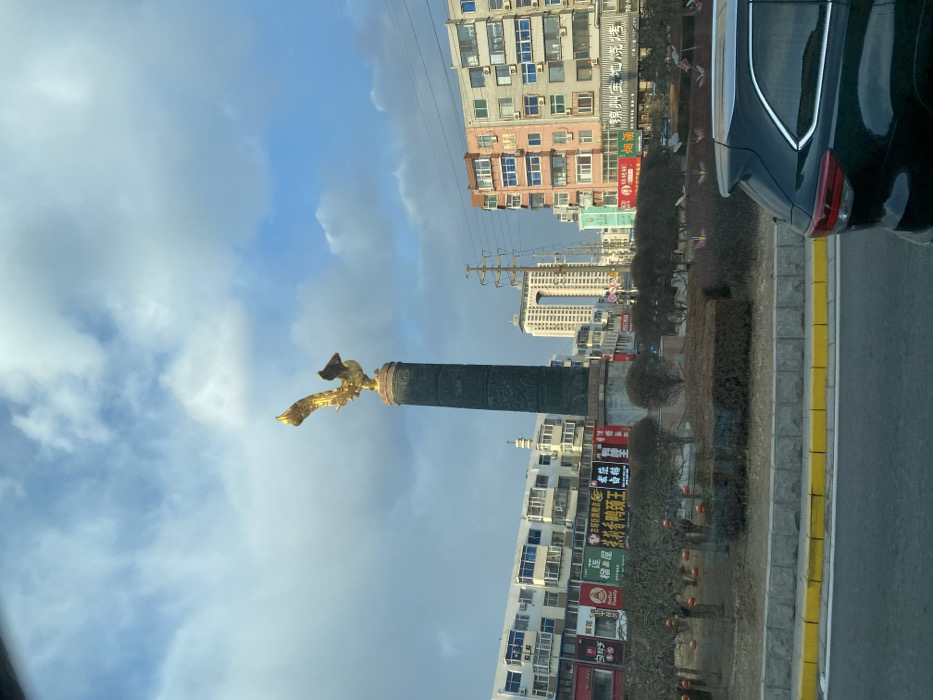 The image displays an urban scene in Jinzhou, China, centered around a prominent monument. A tall, dark-colored cylindrical column, adorned with relief carvings, supports a large golden statue of a winged creature, likely a phoenix or eagle, with its wings outstretched upwards. This monument is situated within a landscaped traffic island or median, containing bare deciduous trees, some decorated with red lanterns, and low-lying shrubs. Surrounding the monument are multi-story buildings lining the streets. To the left, a row of light-colored residential and commercial buildings with varied facades is visible, behind which a white tower resembling a minaret is partially discernible. To the right, another set of multi-story buildings, displaying a mix of pastel and neutral tones, features numerous windows and ground-floor businesses with prominent Chinese character signage. In the background, a modern high-rise building with a distinctive central vertical void is present, along with utility poles and overhead power lines. In the immediate foreground, a paved roadway with a yellow curb is visible. The rear section of a dark-colored SUV or crossover vehicle is partially captured on the right edge of the frame. The sky overhead is partly cloudy, revealing significant patches of blue, indicating daylight conditions. No individuals are visible within the scene.