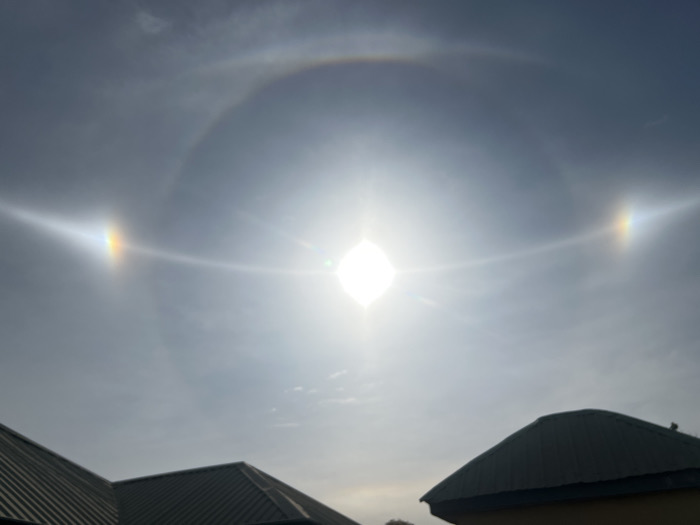 The image captures a celestial phenomenon over Jos, Nigeria. The bright sun is positioned centrally in a mostly clear, light blue sky. Two prominent, rainbow-colored parhelia (sun dogs) are visible horizontally on either side of the sun, appearing as bright patches of refracted light. A faint 22-degree solar halo encircles the sun, and a broader, less distinct arc, possibly a circumscribed halo or supralateral arc, is partially visible above the sun, connecting the parhelia. The lower portion of the frame shows the dark, corrugated metal roofs of two buildings. The roof on the left is steeply pitched, while the one on the right has a gentler curve. No individuals or specific activities are depicted.