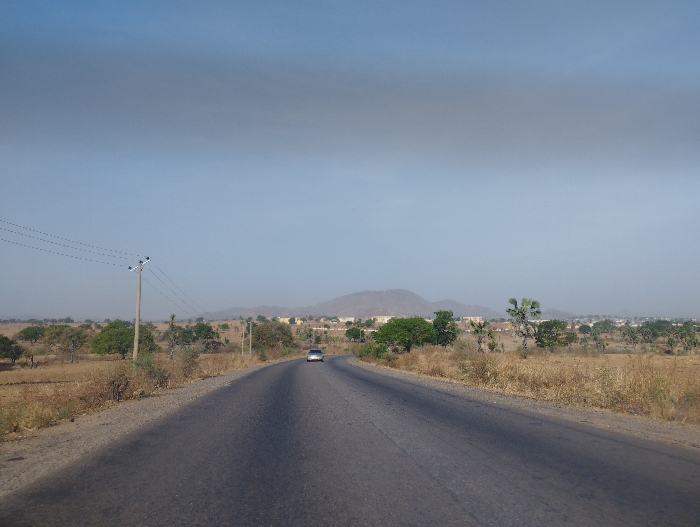A paved road stretches into the distance, flanked by dry, brown vegetation and scattered trees. A lone car travels towards the viewer, its headlights barely visible. In the background, a small town, likely Taiyere, Nigeria (latitude: 9.83, longitude: 11.364), appears nestled at the foot of a low-lying hill. Overhead, a clear blue sky with a few wisps of white clouds dominates the scene. Power lines and poles mark the roadside, adding an industrial element to the otherwise natural setting.