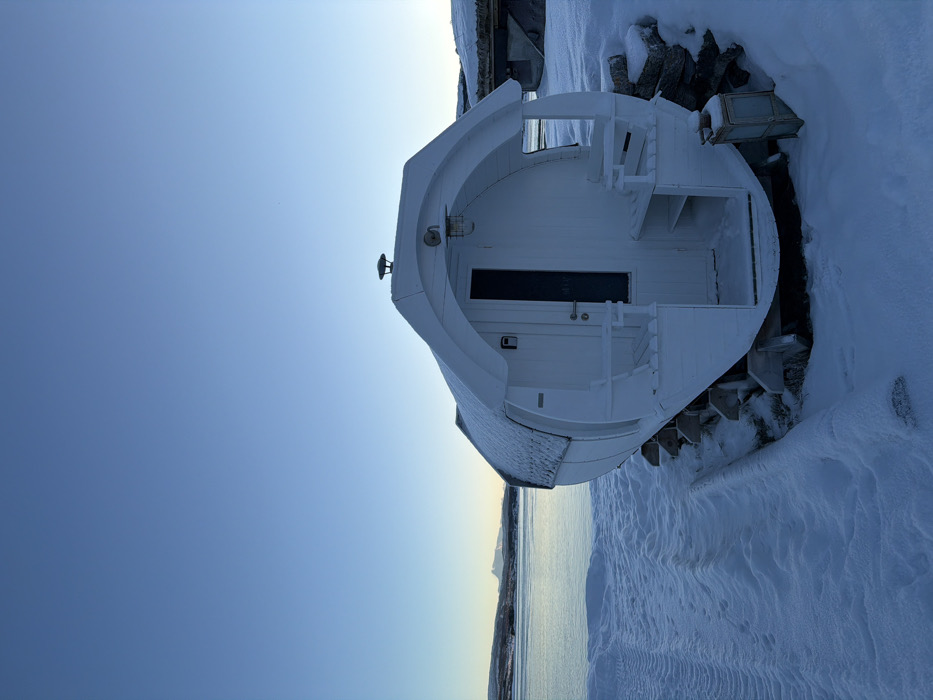 - "The scene depicts a white, barrel-shaped structure, identified as a sauna or cabin, situated on a snow-covered bank beside a body of water in Harstad, Norway" by FM-AJf9d2, licensed under CC BY 4.0