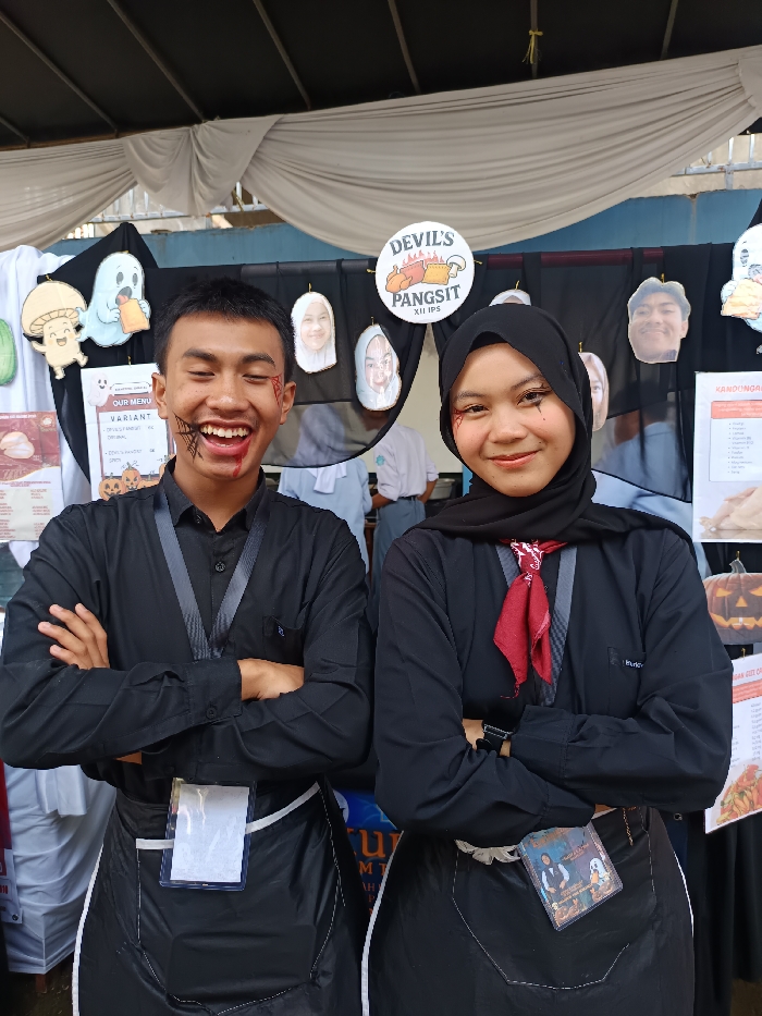 Two teenagers, dressed in black shirts and aprons, stand smiling with arms crossed. The boy has a drawn spiderweb and blood effect on his face. The girl wears a hijab, a red scarf, and similar makeup. Behind them is a booth decorated with a banner that says "Devil's Pangsit", along with cutouts of food items and faces of people that are presumably their team. This Halloween-themed booth has a menu, ingredients lists, and decorations, including a pumpkin.