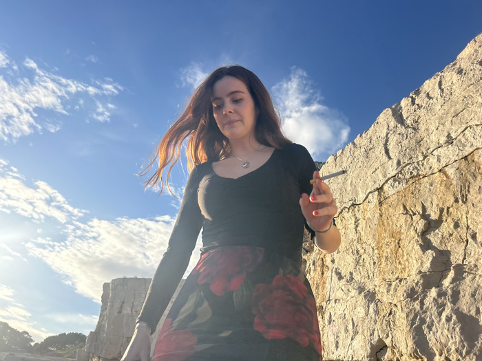 A female individual, approximately 20-30 years of age with reddish-brown hair, is depicted outdoors in Cassis, France, against a bright blue sky with scattered white clouds. She is captured from a low-angle perspective, looking downwards and slightly to her left. Her hair is illuminated by warm sunlight originating from the left. She wears a black long-sleeved top with a scooped neckline, a dark skirt featuring prominent red floral patterns, and a silver-toned pendant necklace. Her right hand, with red nail polish, holds a lit cigarette between her index and middle fingers. The background features a large, rugged, light-colored limestone cliff face on the right, displaying visible cracks and natural striations. To the left, a distant rocky outcrop is partially visible with green vegetation, likely pine trees, at its base.