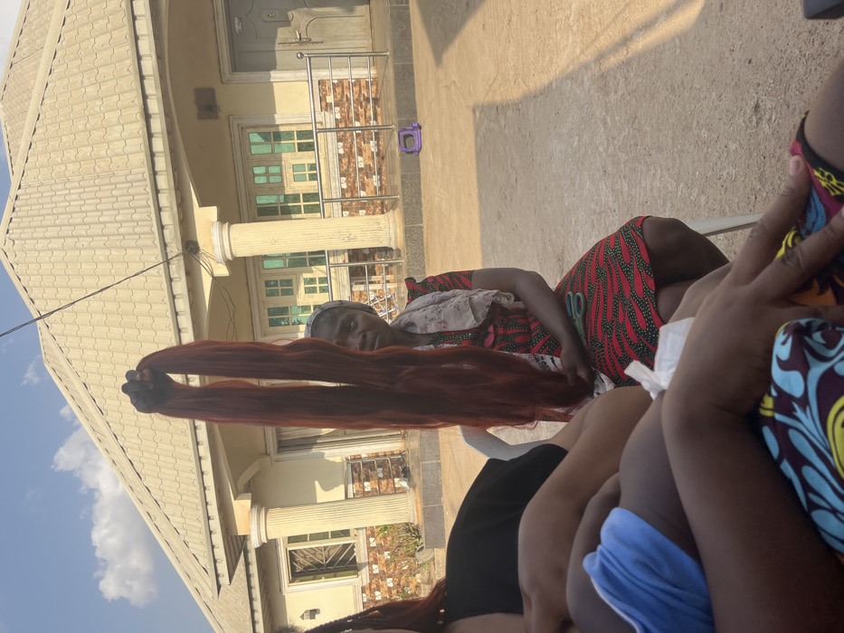 The image portrays an outdoor scene in Kakau, Nigeria, under direct sunlight. In the foreground, partially visible on the left, is an individual wearing a black top, with another person or child in a blue top alongside them, their laps covered by a vibrant blue, yellow, and black patterned fabric. To the right of them, a dark-skinned adult female is seated on a white plastic chair. She wears a red dress with a black and green patterned design and a light-colored head covering or scarf. With her left hand, she holds a long, thick bundle of reddish-brown hair extensions vertically in the air. Her right hand rests in her lap, holding a pair of green-handled scissors. Her gaze is directed towards the left side of the frame. In the midground, a single-story residential building with a light beige tiled roof and a cream-colored facade serves as the backdrop. The house features a porch with two large, fluted, light-colored columns and a low silver-colored metal railing. Multiple windows with green-tinted glass are visible across the front of the house, and a brown door is present on the right side. Overhead, black utility lines cross the bright blue sky, which has minimal cloud cover. The ground surface is bare, dry, light-colored earth. A small, purple plastic stool or container is visible on the ground near the house's porch railing. Strong shadows are cast to the left, indicating the sun's position.