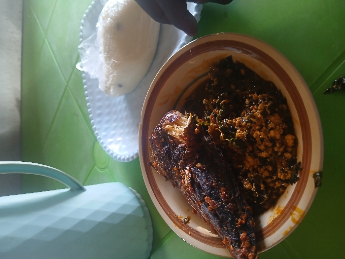 An overhead perspective captures a meal set on a bright green table in Marke, Nigeria