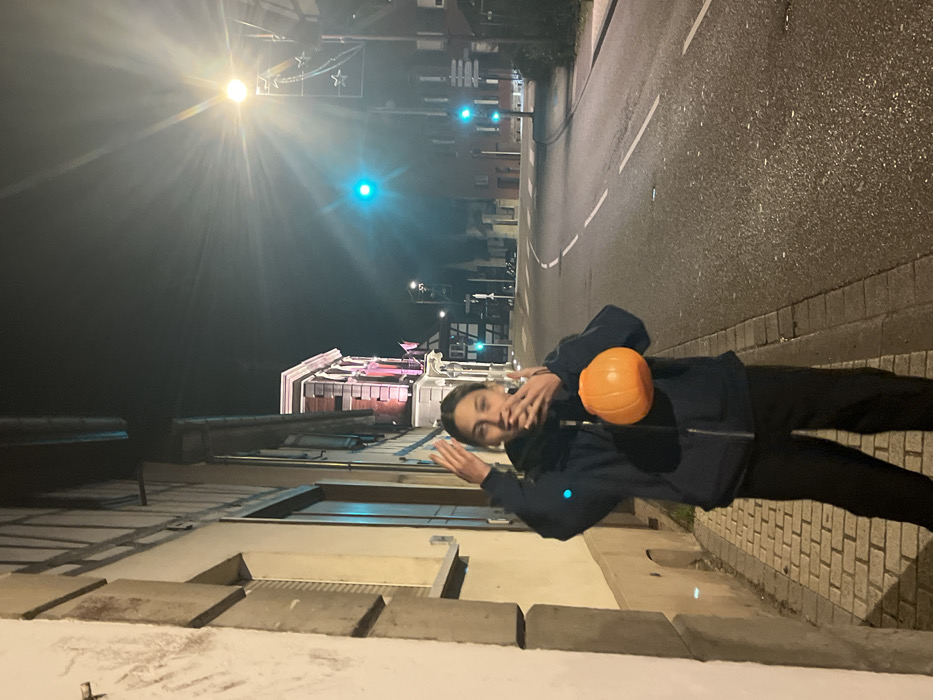 The image depicts a nighttime urban street scene in Lampertheim, France. A young individual stands on a light-colored brick sidewalk in the foreground, wearing a dark blue zip-up hoodie, a dark scarf, and dark trousers. Their hands are raised near their face, and they are holding an orange plastic pumpkin-shaped bucket in their right hand. To the left, a building with a light-colored facade and a large wooden door is visible. Further down the street on the left, another building with a prominent red brick facade is illuminated with pink light, with a half-timbered structure visible beyond it. The street, featuring dark asphalt and white dashed lane markings, curves to the right into the distance. A bright streetlamp, adorned with a star-shaped decoration, is positioned on the right, casting significant illumination. Multiple green traffic lights are visible further down the street. The scene is lit by various artificial light sources.