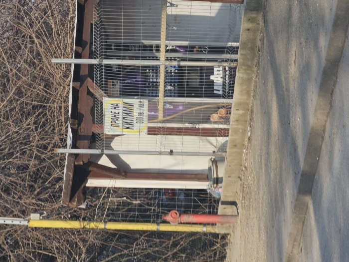 The image depicts an outdoor scene in Silistra, Bulgaria, featuring a small commercial structure adjacent to a paved area. The structure, observed from a slightly elevated perspective, has a white and dark-brown wooden frame supporting a light-colored, possibly corrugated, roof. Its front is secured by a gray metal mesh fence or gate. A yellow sign affixed to the fence displays text in Bulgarian, "ПРАНЕ НА КИЛИМИ" (Carpet Washing), along with a price "3.00 лв./кв.м." (3.00 BGN/sq.m.). Inside the caged area, partially obscured items are visible, including a "LAVAZZA" branded element. To the left of the structure, a tall, slender yellow pole stands vertically, with a small white rectangular object attached near its top. At the base of this pole, a red fire hydrant or similar utility fixture is partially visible. Both the pole and the hydrant are positioned behind a low concrete wall or curb that runs along the front of the structure. The immediate foreground consists of a light gray asphalt or paved surface, featuring a distinct concrete curb extending horizontally across the bottom of the frame. Shadows are cast onto this paved surface, indicating direct sunlight from an unseen source. The background is dominated by a dense thicket of bare, tangled tree branches or bushes, suggesting a dormant vegetative state. A secondary section of metal mesh fencing is discernible between the yellow pole and the background vegetation. No individuals or active interactions are present within the frame.
