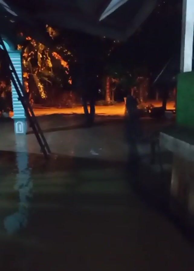 At night, the view from under a roof shows floodwater surrounding a blue house