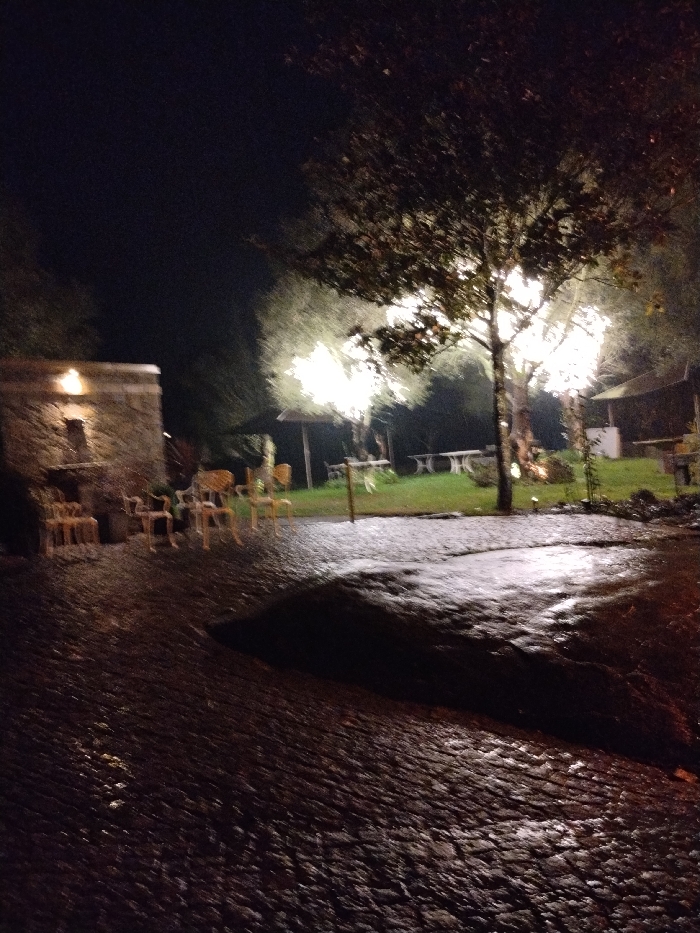 A night scene features a cobblestone courtyard leading to a grassy area illuminated by strings of lights hung from trees. Several chairs sit near a stone building with a single lit window. Further back, picnic tables and shelters are visible. The ground appears wet and reflective, enhancing the overall darkness of the scene.