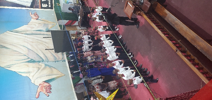 A group of people, mostly children, are standing in a line. Most wear white shirts. Some wear colorful head coverings. An adult in a dark suit stands in front. A poster with a large image of a person in white robes and a blue background is visible. There's a stairway with red carpet on the side, and a Christmas star ornament is visible.