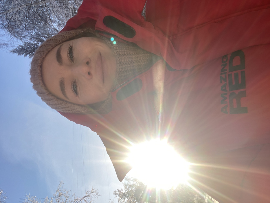 A selfie of a woman in a red jacket and a beige knit hat taken outdoors on a sunny day. Her face is angled slightly upward towards the camera. The sun is bright, causing glare, obscuring details. The jacket has the text "AMAZING RED" printed on the side. The background includes trees with frost and a clear blue sky. The photo appears to have been taken from a low angle, looking up at the subject.