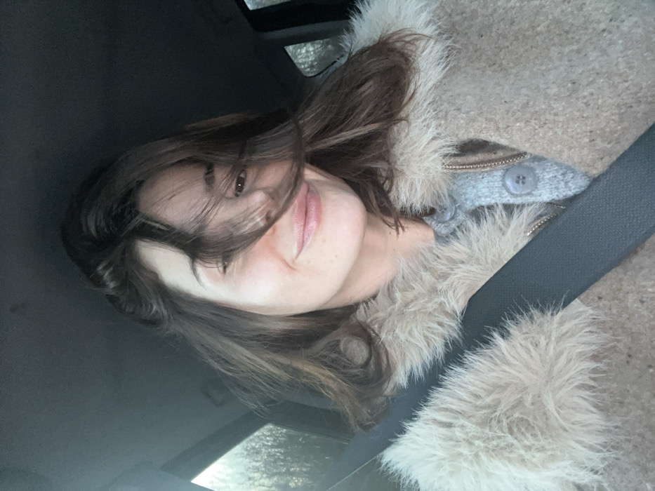 A front-facing, waist-up image depicts an individual, an adult female, inside a vehicle in Villeneuve-d'Ascq, France. The subject wears a light brown or beige textured coat featuring a prominent, shaggy light-colored faux fur collar, over what appears to be a light grey knitted garment with visible buttons and a zipper. A dark-colored seatbelt diagonally traverses her torso from the upper left to the lower right. Her brown hair is partially disheveled, with strands crossing her face, particularly near her eyes and mouth. She is smiling with closed lips. The vehicle's dark interior roof lining is visible in the upper portion of the frame. Through a window on the left side, the blurred outline of trees or dense vegetation is discernible, indicating an outdoor setting during daylight hours.