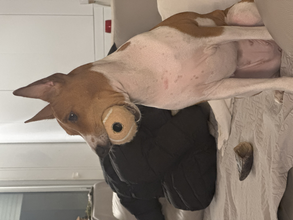 - "A brown and white dog rests on a bed, cheek pressed against a tennis ball toy" by FM-6cR2A2, licensed under CC BY 4.0
