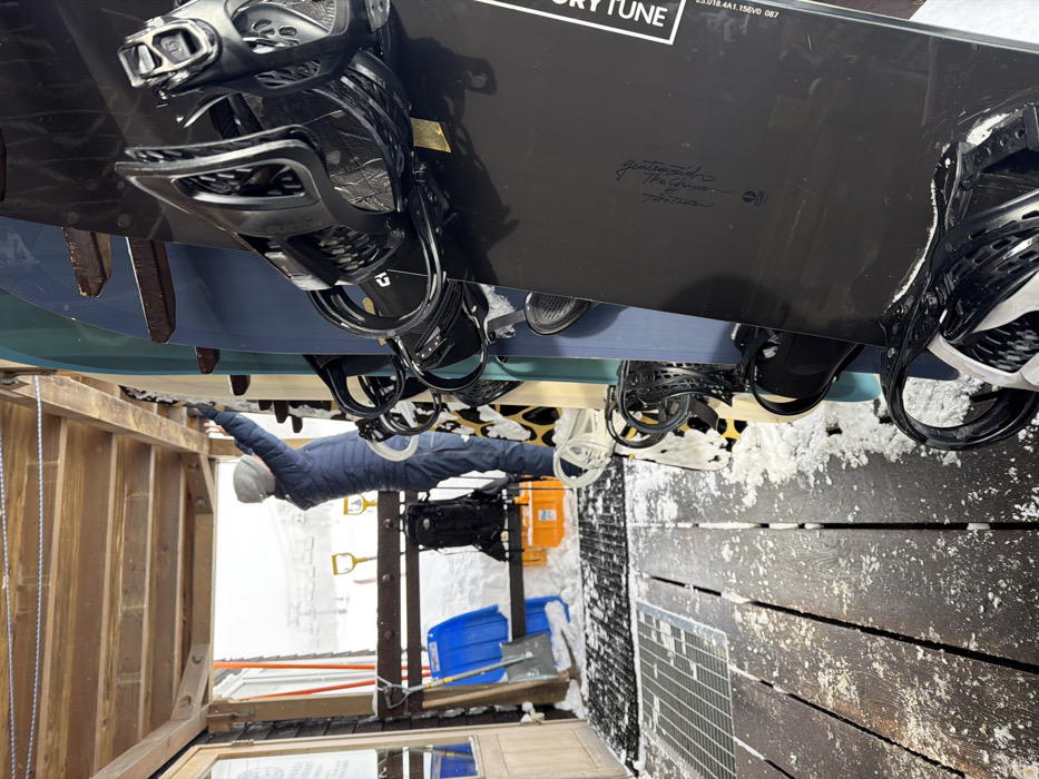 multiple snowboards stacked on a wooden deck covered in snow. A person wearing a gray hat and blue jacket lies stretched underneath the boards, near a wooden building frame. Orange and blue bins, a black bag, and shovels are visible behind the person. The top snowboard is black with gray bindings and "FACTORY TUNE" printed on it, along with a signature.
