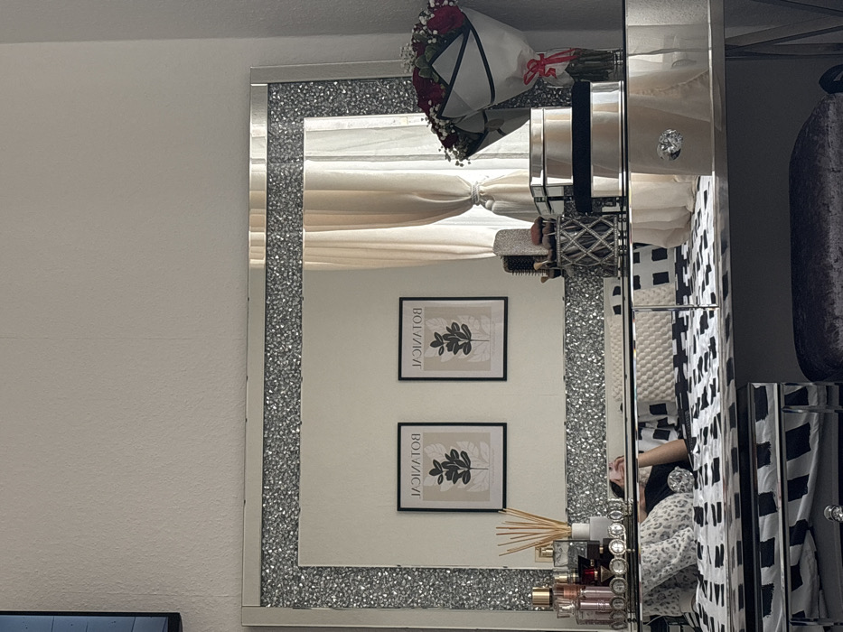 This image depicts an interior room in an unspecified location within the city of Duisburg, Germany. A large rectangular vanity mirror with a frame adorned with a silver-colored crushed glass or glitter effect dominates the center. The mirror reflects a light-colored wall with two framed botanical prints, each displaying a dark green leafy plant illustration and the reversed text "BOTANICAL." Directly in front of and beneath the mirror is a mirrored vanity table. On its surface, from left to right, are: multiple perfume bottles on a decorative mirrored tray, a reed diffuser with wooden reeds, a cylindrical holder containing various makeup brushes, two silver-colored rectangular boxes, and a glass vase holding a bouquet of red roses and white baby's breath, wrapped in white and black paper with a red ribbon. The mirror's reflection also reveals a person lying on a bed behind the viewer. The bed is covered with a black and white patterned duvet, and a leopard-print pillow is visible. The person's arm and hand, holding what appears to be a remote control or phone, are reflected. Further reflections show light-colored (likely beige or cream) curtains tied back from a window, and a section of a wall-mounted television screen is visible in the upper left portion of the image, above the mirror. A dark upholstered stool is partially visible in the foreground beneath the vanity table. The room's walls are a plain, light color.