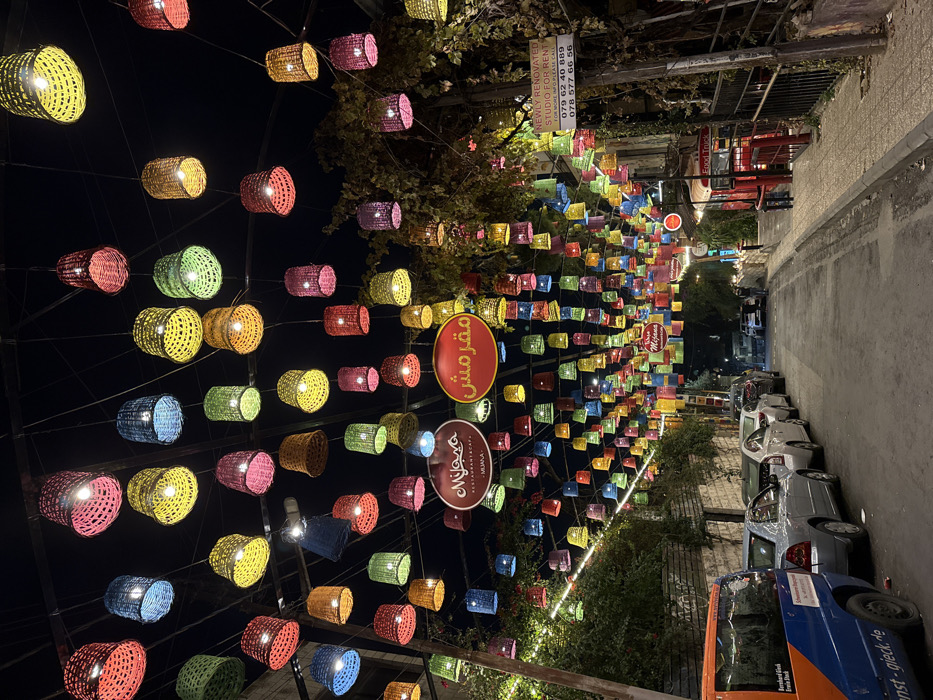 The street scene is at night and decorated with colorful woven lanterns hanging overhead. A restaurant sign "Milana" is visible in Arabic and English. A sign advertising "Newly Renovated Studio For Rent" with phone numbers is also seen. A "Food Truck" is slightly visible. Cars are parked along the street. Signs indicate "Mufana" and "مقرمش". The lighting creates a festive and lively atmosphere in the urban environment.