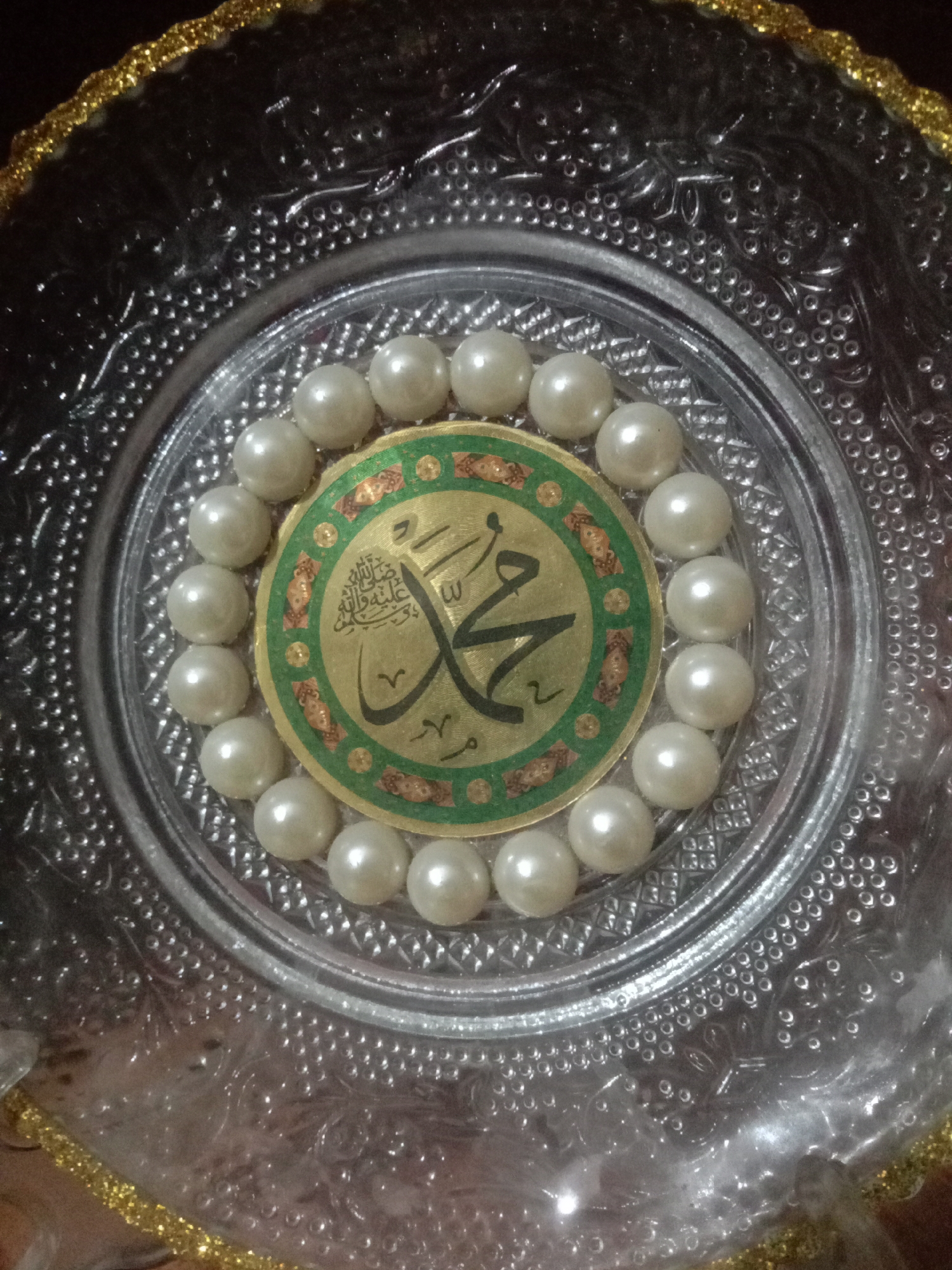 A close-up, top-down image depicts a circular decorative object resting within a clear, embossed glass or plastic plate. The central feature is a golden-green circular emblem, approximately 7-8 cm in diameter, displaying the name "Muhammad" (محمد) in large black Arabic calligraphy, accompanied by the phrase "Sallallahu alayhi wa sallam" (صلى الله عليه وسلم) above it. This emblem is surrounded by approximately 23-24 spherical, off-white beads, consistent with imitation pearls. The clear plate features a textured surface with patterns of small raised dots and relief designs. A golden, glittery trim is visible along the outer edge of the plate or the surface it rests upon. The background is dark and indistinct. No people, specific actions, or interactions are present. The image contains no visual information to confirm the location as Depalpur, Pakistan.