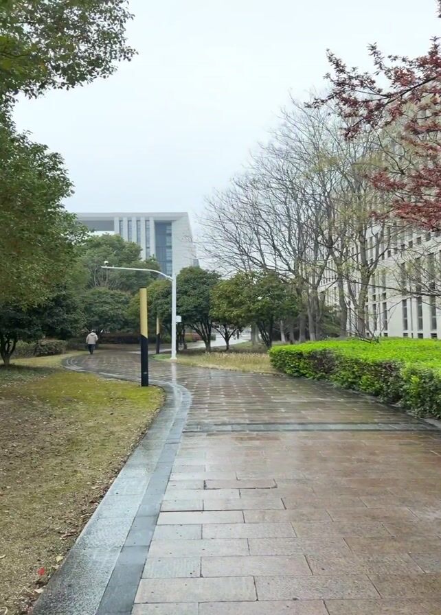 paved pathway in a park or campus setting on a wet day. The pathway is made of rectangular stones and is lined with green bushes and trees. A building with multiple windows is visible in the background, as well as light poles. A person can be seen walking away from the camera on the path. The overall environment appears damp and overcast.