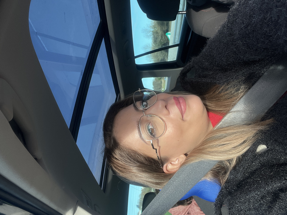 The image displays an adult female seated in the front passenger seat of a vehicle, believed to be located in Hérouville-Saint-Clair, France. She is positioned for a self-portrait, looking directly at the camera with a slight smile. Her hair is light brown/blonde, parted on her left, falling over her shoulders. She wears gold-framed eyeglasses with a distinctive wavy design on the temples, a red garment visible at the neckline, and a dark, textured, possibly black, outer garment. A grey seatbelt diagonally crosses her chest. A blue object, possibly a support cushion, is visible near her left shoulder behind the seatbelt. The vehicle's interior features a light grey headliner and a large panoramic sunroof with tinted glass above. Through the side and rear windows, a bright, sunny outdoor environment is visible, characterized by a clear blue sky and a landscape of trees, consistent with a roadside or highway setting, with a distant green road sign or barrier.