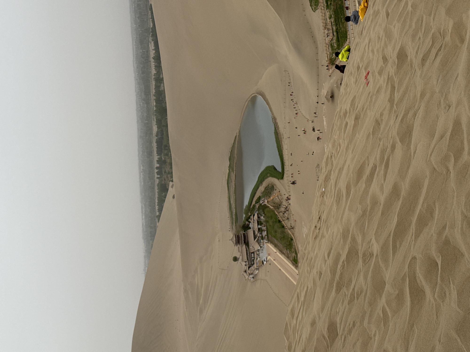 The image presents a view of Crescent Lake in Dunhuang City, China. The lake is a crescent-shaped body of water nestled amidst sand dunes. Buildings and vegetation are located along one edge of the lake. People are scattered near the shoreline. The surrounding environment consists of vast sand dunes and a distant, hazy landscape.