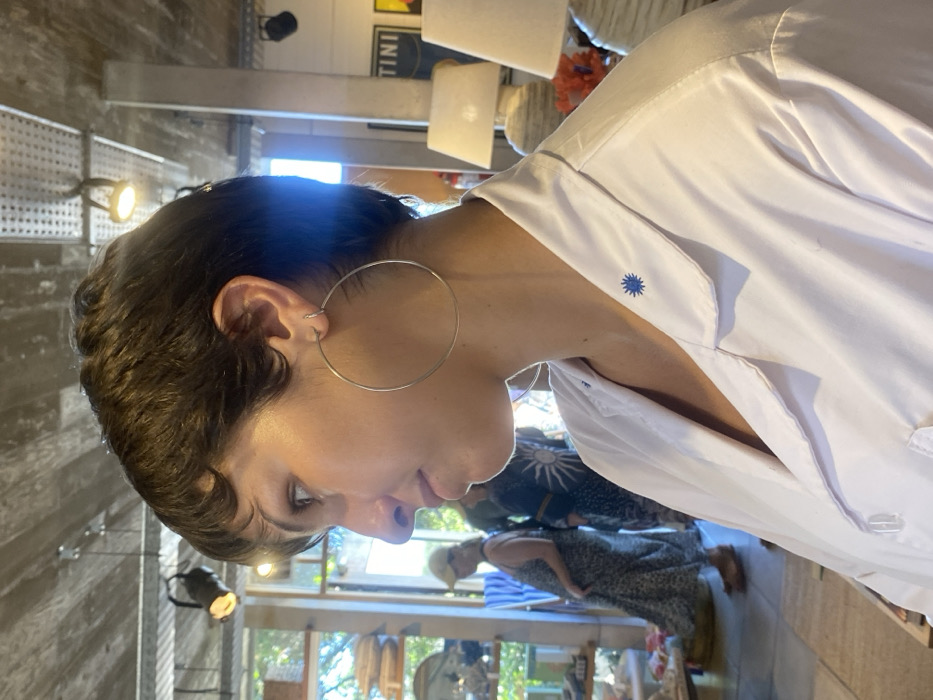 A woman with short, dark, wavy hair wears a large silver hoop earring. She is slightly turned, looking down and to the side. She wears a white button-down shirt with a small blue star embroidered near the collar. In the background, a person in a patterned dress and a light hat stands near merchandise in a store setting with natural light. The interior space appears to have a concrete or rustic design.