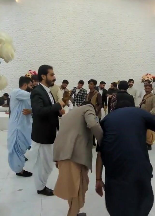 A group of men is dancing to the beat of a dhol in a large, modern event hall. Most of the men are dressed in traditional Pakistani clothing like shalwar kameez, while others are wearing suits. They are smiling and appear to be enjoying themselves. The hall is decorated with white walls, flower arrangements, and bright, modern lighting. The floor is white and shiny. There are other people standing or sitting around the edges of the group, watching and observing. The overall atmosphere is festive and celebratory.