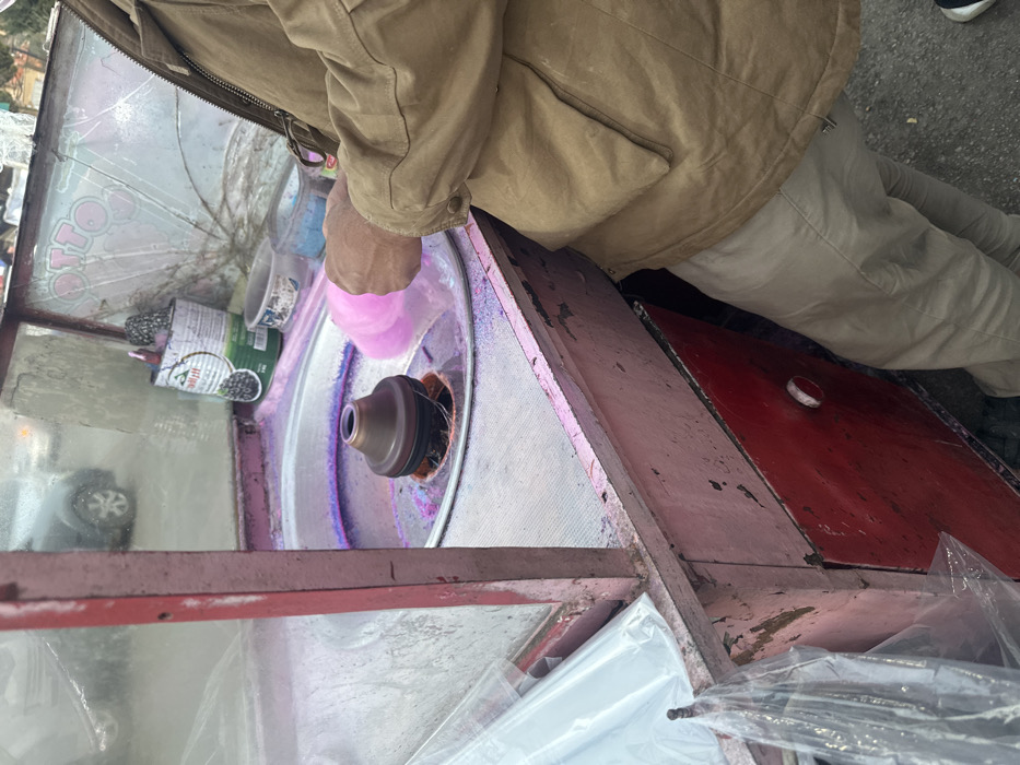 The image depicts a close-up perspective of a street vendor operating a cotton candy machine from a worn, mobile cart in the city of Unknown, Unknown