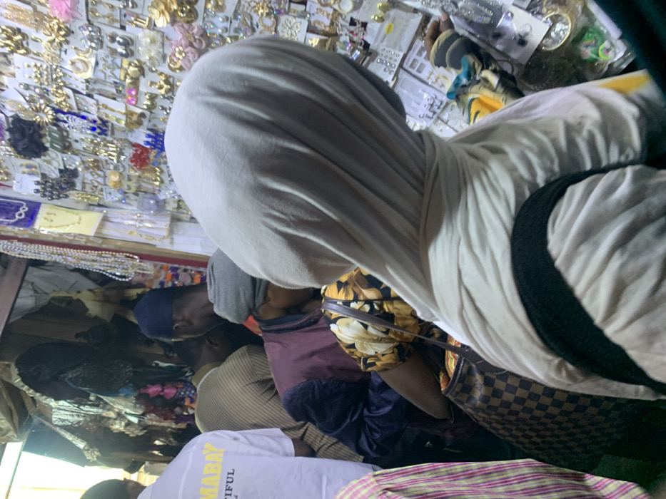 A bustling marketplace scene. Numerous individuals are crowded together browsing a vast array of jewelry and accessories displayed on shelves. A person wearing a light-colored head covering is prominently positioned in the foreground, obscuring some of the view. Other people, some wearing head coverings, are visible amidst the crowd. There are a lot of small golden items. It is very colorful and crowded.