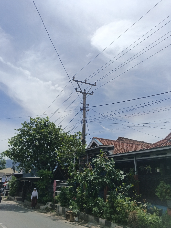 A street scene shows a utility pole cluttered with wires stretching across a partly cloudy sky. To the pole's left, a large tree is visible near a roadside curb. A person in a white shirt and dark skirt walks on the sidewalk. A house with a terracotta tiled roof and a shaded porch filled with plants stands to the right of the pole. The road stretches into the lower part of the image.