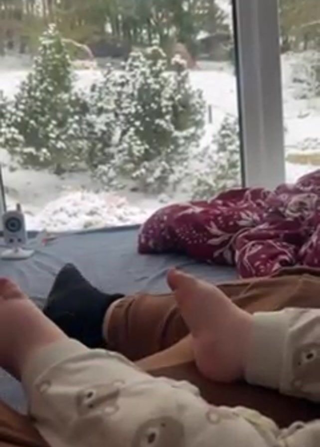 A person with bare feet is lying on a bed covered with a patterned blanket, next to another person wearing brown pants and a black sock. The first person is wearing pajama pants with a bear pattern. A baby monitor sits on the bed nearby. Outside the window, snow covers the trees and ground. The person in pajamas raises their feet in the air.