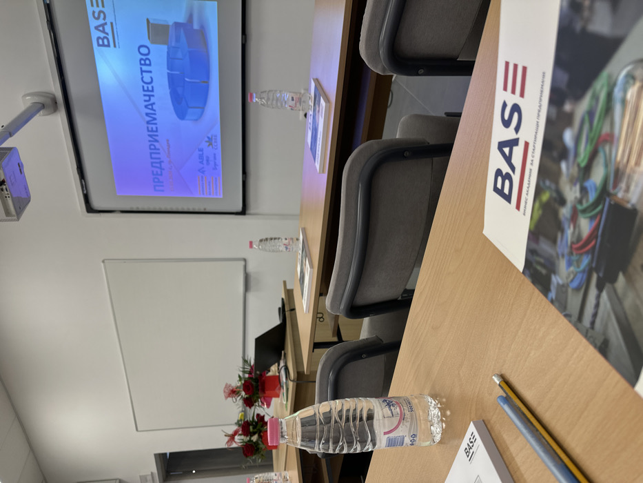This is an interior view of a vacant classroom or conference room, presumably located within the Business Academy for Startup Entrepreneurs (BASE) in Plovdiv, Bulgaria, as indicated by visible branding and Bulgarian language