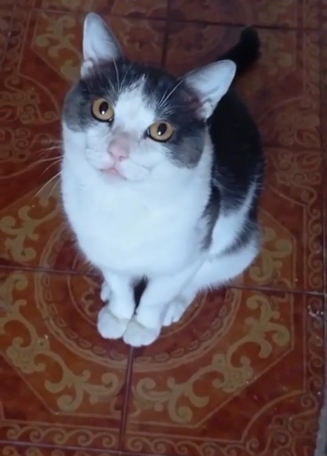- "A white cat with grey markings sits on an orange and brown tiled floor and meows, looking upwards" by FM-k5Dk42, licensed under CC BY 4.0