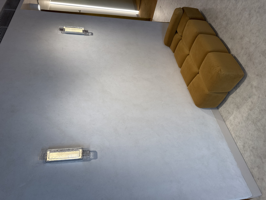 A view of a wall featuring two chrome lights that are rectangular. The wall is a light gray color, and there is a brown sectional sofa in the corner. The angle of the view is diagonal, as one side of the wall is longer than the other. The room has a modern style, and the sofa looks comfortable.