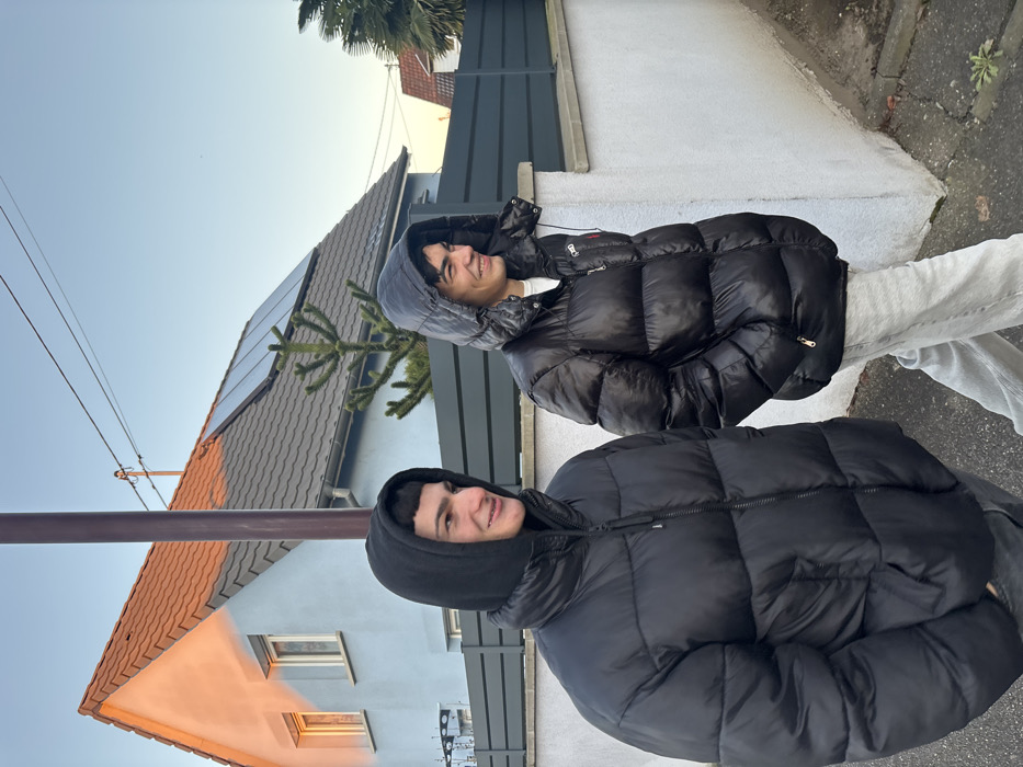 The image depicts two young adult males walking on a sidewalk in a residential area of Ostwald, France, during late afternoon or early evening, evidenced by warm, golden sunlight on buildings and a clear blue sky. Both subjects are dressed in black hooded puffer jackets and are smiling, looking towards their left. The subject on the left wears a matte black jacket, while the subject on the right wears a shinier black jacket with a small red logo on the left chest and light-colored trousers. In the background, a light blue house with a terracotta-tiled gable roof is visible, with its left side illuminated by sunlight. Further right, a dark-roofed building equipped with solar panels stands behind a dark grey horizontal slatted fence. A distinctive spiky conifer-like tree grows in front of the solar-paneled building. A brown utility pole and overhead wires are also present. The ground consists of a grey paved sidewalk.