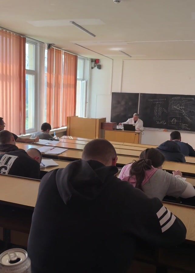The camera pans out from a person’s desk in a university classroom. The desks are wood with a metal frame, and several people sit in the rows. The people appear to be students. The classroom is well lit by natural light through tall windows and overhead fluorescent lights. The windows have orange blinds. An older male instructor is at the front of the class in a white coat, speaking to the class and gesturing at a blackboard behind him. A projector screen is above him. The student on the far right turns and gives the peace sign to the camera. There is a water bottle on the desk next to him.