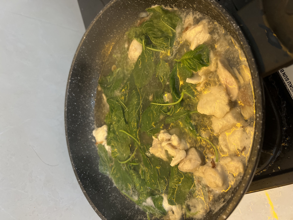The image displays a black, speckled frying pan containing simmering food, observed from an overhead perspective within what appears to be a kitchen in Celuk, Indonesia. The pan holds a clear, bubbling liquid broth in which numerous dark green leafy vegetables, consistent with spinach or similar greens, are interspersed with irregularly shaped chunks of cooked white meat, likely chicken. Some light-colored foam or scum is visible on the liquid's surface. The pan rests on a black stovetop, partially obscuring a label that includes the text "NGKU SUN B". The background consists of a light-colored, possibly tiled or painted wall, showing minor texture and a single strand of dark hair adhering to its surface in the upper left quadrant. No individuals are present in the scene.