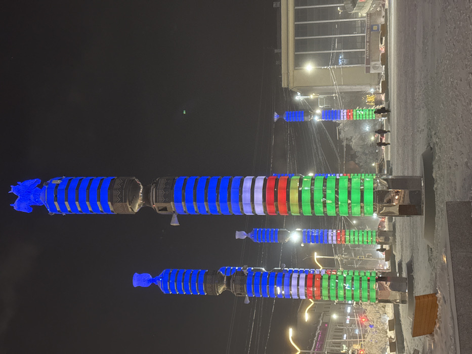 The image depicts an illuminated urban square at night, covered in snow, located on Lenin Square in Yakutsk, Russia. Five tall, cylindrical decorative columns, ranging in height, are the central subjects. The most prominent column in the foreground features internal LED lighting arranged in horizontal bands of blue, white, red, and green, from top to bottom, resting on a reflective silver base. Its apex is crowned with a blue-illuminated translucent sculpture depicting two stylized animal heads, possibly horses, facing each other. Other columns in the mid-ground exhibit similar segmented lighting, some predominantly blue, others displaying multiple colors. The ground throughout the square is uniformly covered in a layer of snow. In the mid-ground, several indistinct human figures, silhouetted against the ambient light, are observed walking across the snow-covered expanse. To the right, a multi-story building with numerous large windows is visible, showing internal illumination. Conventional streetlights emitting yellow-orange light line a distant street, where faint vehicle lights are discernible. Overhead wires are visible against the dark night sky. A wooden-topped bench, partially obscured by snow, is present in the lower-left foreground.