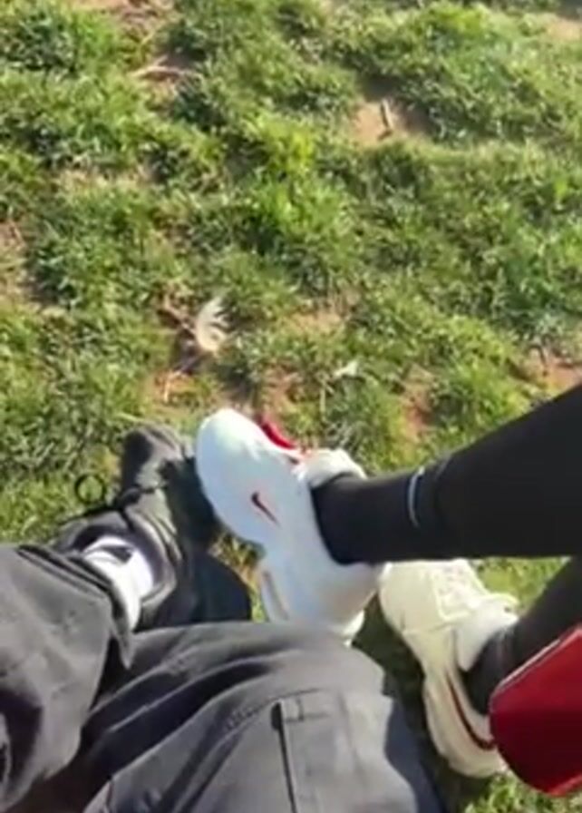 Here's a concise description of the video: The video opens with a view of two people sitting on a grassy area