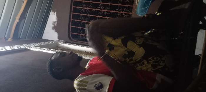 A young adult male, dark-skinned with short dark hair and a beard, is depicted seated in profile facing right. He wears a red and white short-sleeved t-shirt with a "Premier League" patch and the number "7" on the sleeve, and black shorts with yellow patterns. A light-colored bracelet is visible on his left wrist. His left knee is bent and raised. The background features a plain dark wall to the left, a white vertical decorative trim, and an ornate pinkish-brown metal-grilled window or door to the right. Above the window, a corrugated metal roof section is visible, with a patch of lighter-colored paint on the wall below it. The scene is dimly lit, suggesting an evening or interior setting in Kinondo ward, Kenya.