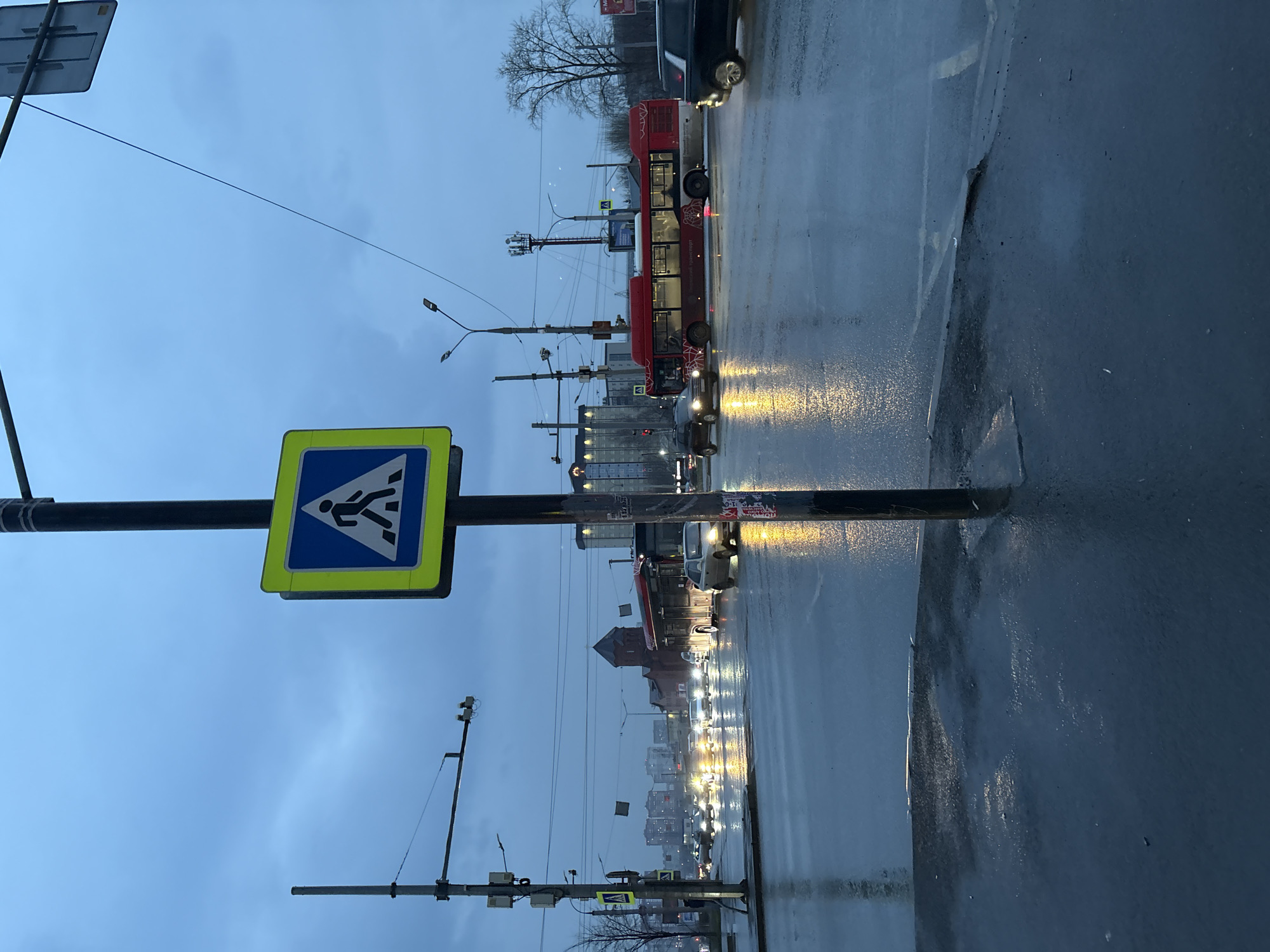 The image depicts a rainy street scene in what appears to be the city of Perm, Russia. The street is wet, with car headlights reflecting off the slick surface. A pedestrian crossing sign is prominent in the foreground, mounted on a black pole. A red double-decker bus is visible, along with cars moving in the traffic flow. Buildings of varying heights line the street, suggesting an urban environment. A mix of streetlights and overhead wires are present. The sky is overcast, indicating a cloudy day.