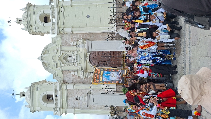A group of people are posing in front of a large, ornate church. They appear to be dressed in traditional or festive clothing with vibrant colors and intricate details. Some individuals hold a banner or flag with religious imagery. The church has a classic architectural style with two bell towers, a large wooden door, and decorative stonework. The scene is likely a cultural or religious celebration.