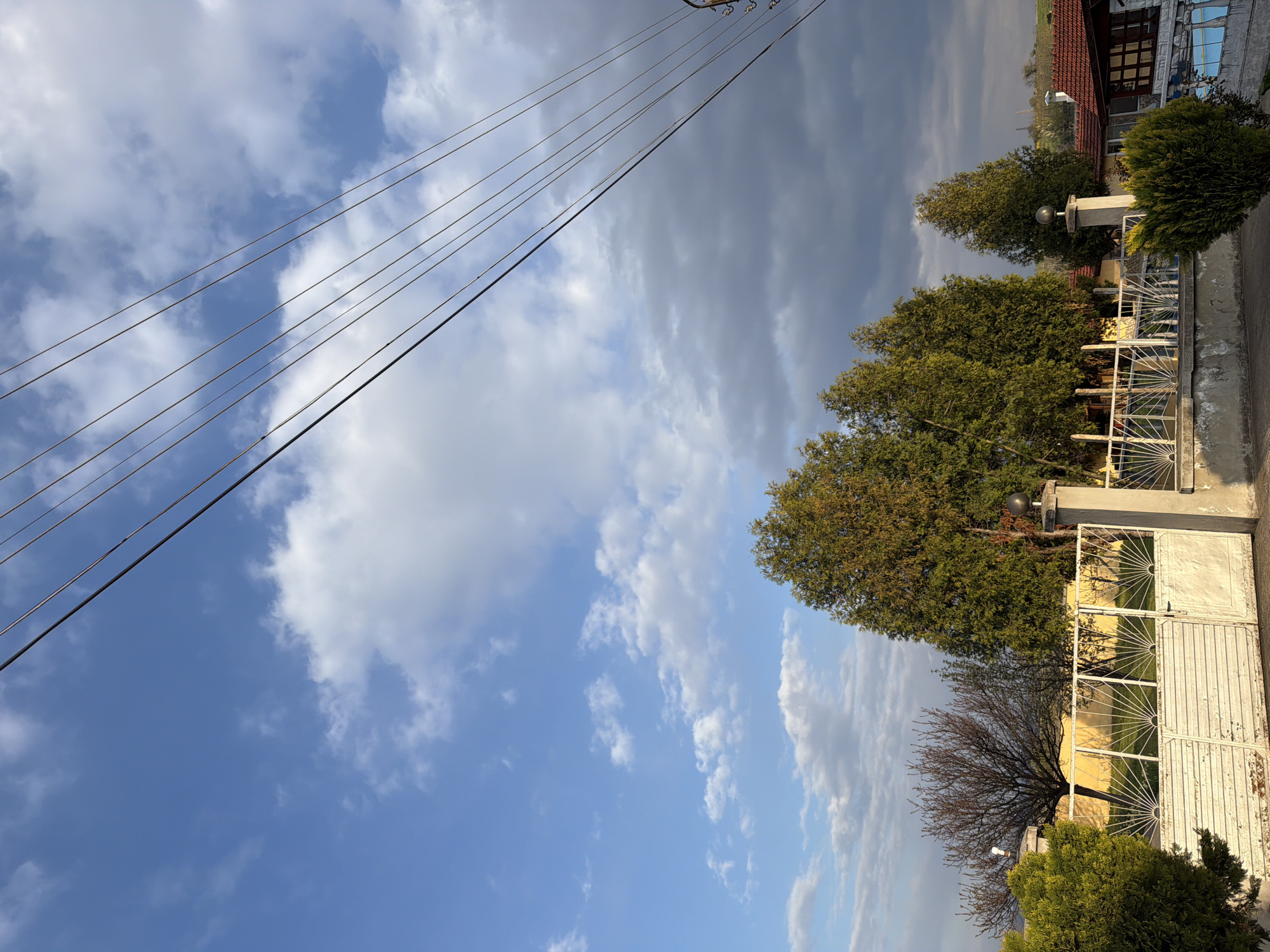 The image presents a ground-level perspective of a residential area, possibly within Dolni Dabnik, Bulgaria. Dominating the upper left quadrant is a blue sky scattered with white cumulus clouds. Power lines traverse diagonally across the sky. On the right side of the frame, a residential property is visible. The foreground includes a white metal fence, partially obscured by greenery, including what appears to be several trees. Beyond the fence, there is the corner of a building with a red tiled roof and a window with mirrored glass.