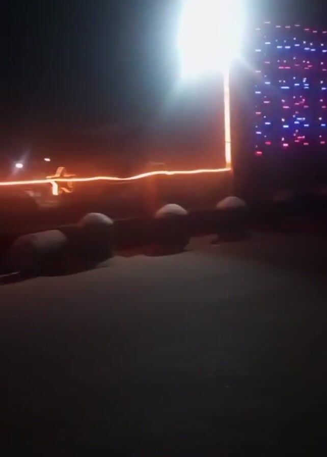 nighttime scene of a street with decorative lighting. The camera is handheld, resulting in shaky footage. In the initial frame, a bright light source illuminates the area, with a section of bollards and a string of yellow lights. To the right, there's a rectangular array of red and blue lights. As the video progresses, the camera pans to the right, revealing a building with a sign that reads "COCINA" and is outlined in purple neon lights. A golden star-shaped light fixture is also visible. Above the building, a green cross-shaped light is discernible. The overall atmosphere is dark, with the decorative lights providing the primary illumination. A tire is visible by the fence of the building.