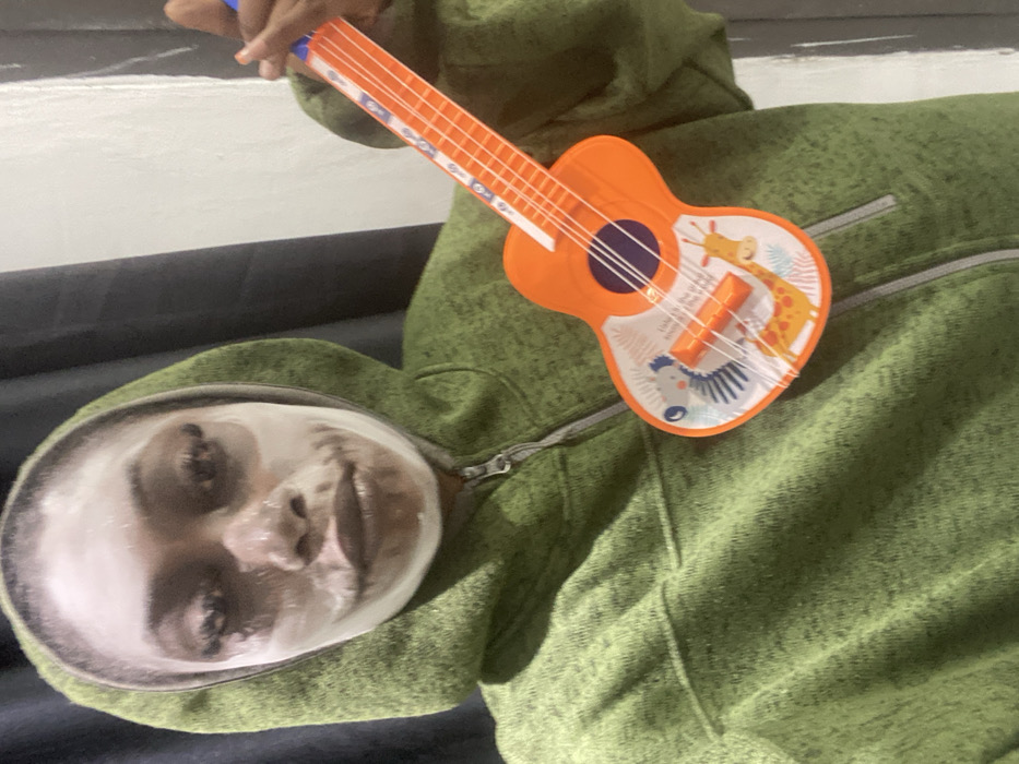 An individual is depicted indoors, ostensibly in Joma, Ghana. The person, positioned centrally and facing forward, wears a green, heathered hooded jacket with a grey zipper. A white facial application covers the forehead, cheeks, nose, and chin, extending slightly around the mouth. Long, dark eyelashes are visible. The individual holds a small, orange toy guitar across their lower torso with their right hand, which displays orange nail polish. The toy guitar features white strings, a blue-ringed soundhole, and a white decal on its body depicting cartoon safari animals (zebra, giraffe, lion) and partial text. The background consists of indistinct dark and light vertical surfaces, suggesting an interior setting with frontal lighting.