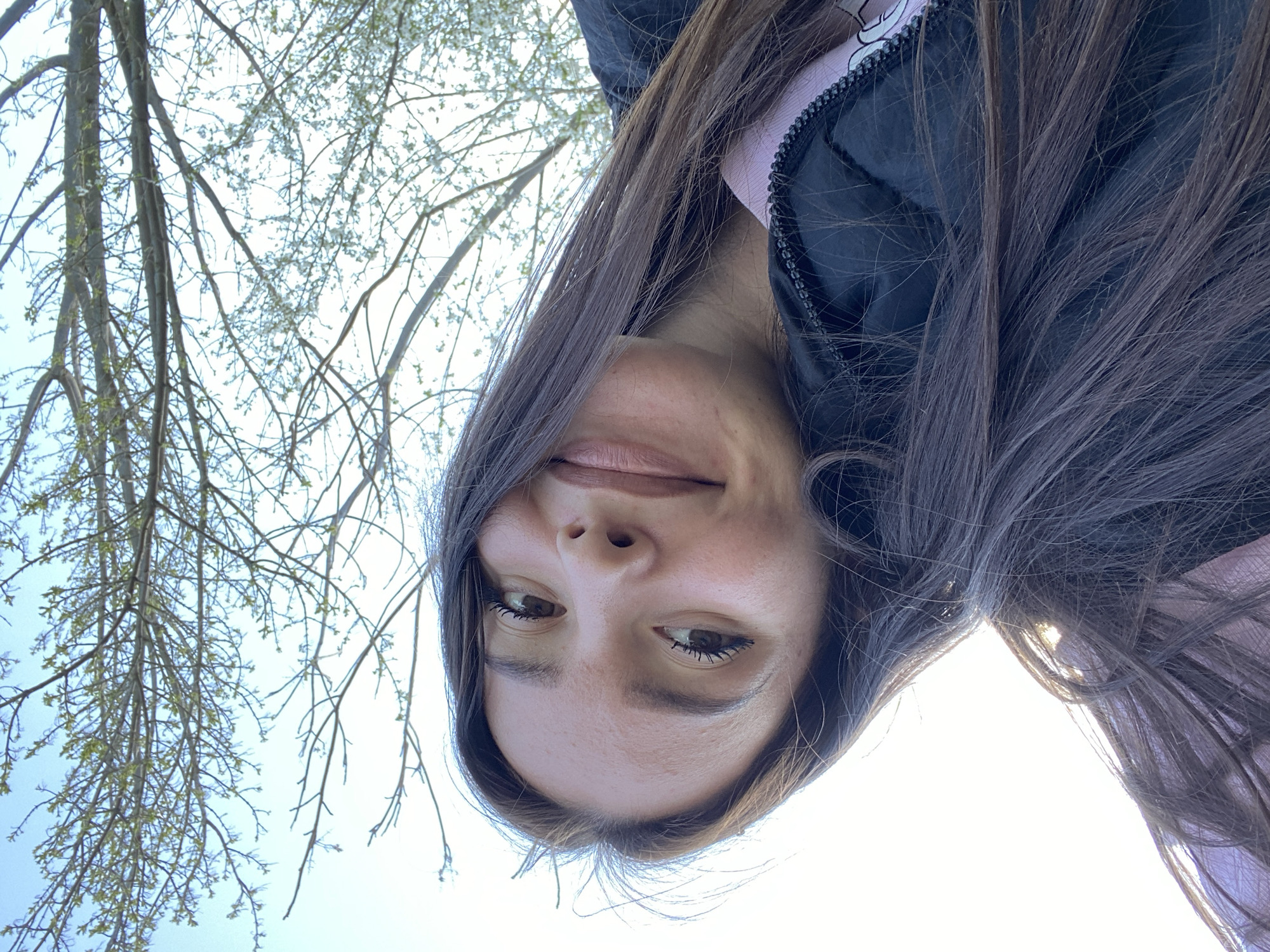 A selfie photo taken outdoors. The camera is pointed upwards at a woman. The woman has long dark hair, light skin, and is wearing a black jacket with a light pink lining. Behind the woman is a tree with small white flowers, and a bright sky. The location appears to be in an urban or suburban park due to the presence of the trees. The city of Podem, Bulgaria cannot be determined from the image alone.